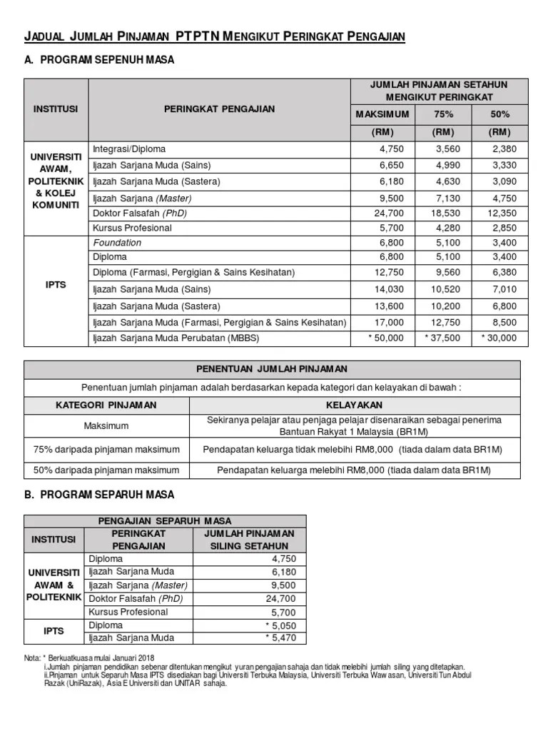 Bagi pelajar kanan program ijazah sarjana muda ataupun program diploma bayaran yuran pengajian hanya boleh dibuat setelah semester bermula berdasarkan . Jadual Jumlah Pembiayaan Ptptn Mengikut Peringkat Pengajian Brosur Pdf